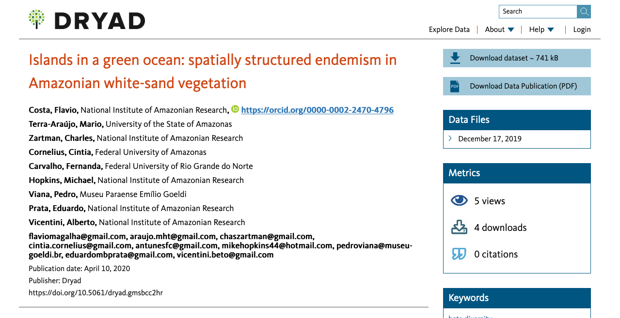 Download dataset: https://datadryad.org/stash/dataset/doi:10.5061/dryad.gmsbcc2hr.Jaramillo et al. (2019) - dados de diversidade de plantas em parcelas espalhadas por ilhas de mata ao redor de Boa Vista, Roraima, Brasil. Baixe os dados neste link, buscando pelo botão