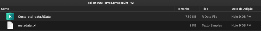 Por padrão, os dados vêm zipados (se você não sabe o que é um arquivo zipado, veja aqui o que é). Para tirar o zip, basta clicar no arquivo duas vezes que uma pasta se abrirá (ou haverá a opção de escolher o local onde se devem armazenar os arquivos contidos dentro do arquivo .zip; caso isso não ocorra, entre em contato comigo para desvendar o que aconteceu). Dentro deste arquivo .zip, há apenas dois arquivos: um chamado Costa_etal_data.RData, e um metadado, metadata.txt.