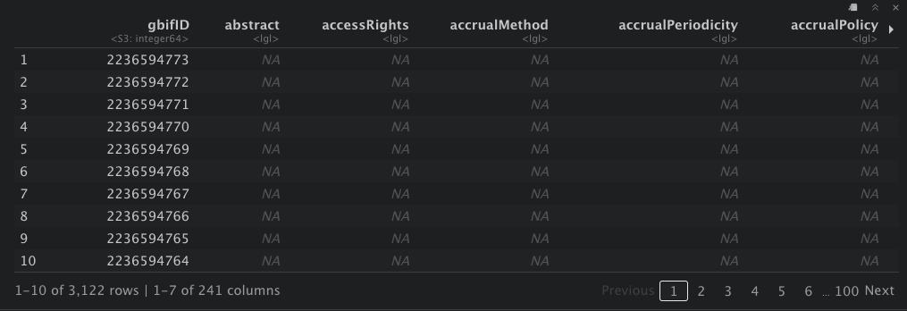 # ℹ 99 more variables: hostingOrganizationKey <chr>, publishingCountry <chr>,