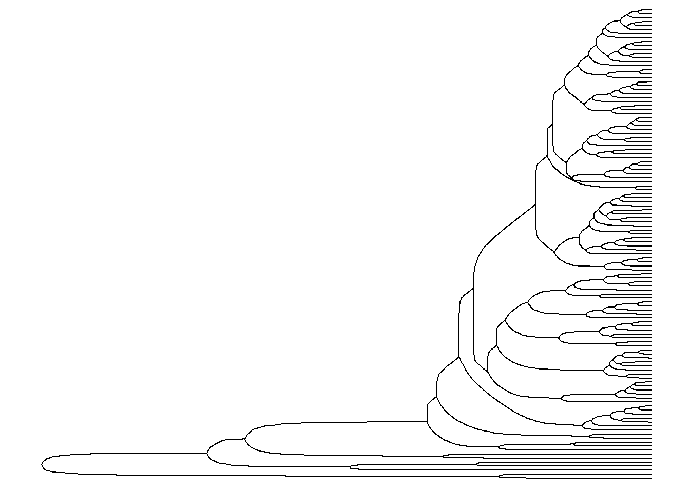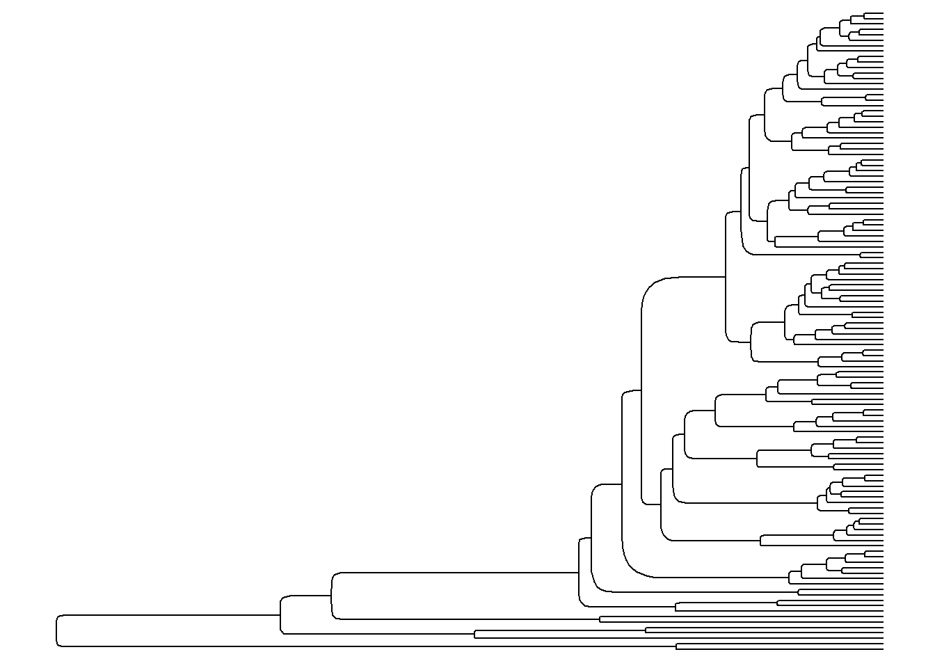 ggtree(arvore)Imediatamente, é plotada uma árvore. Por padrão, ela aparece em forma de escada (ladderized em inglês).
