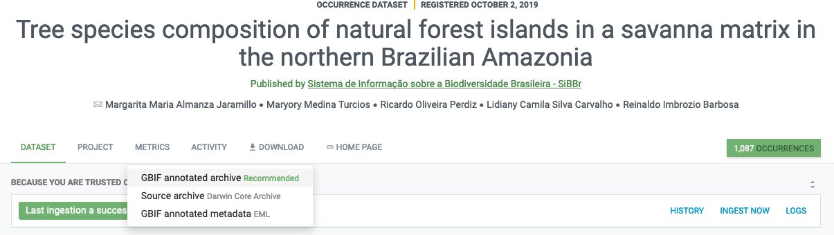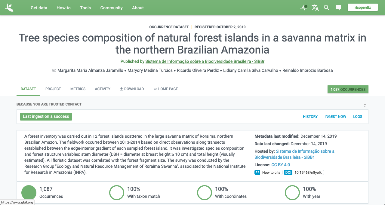 Download: https://www.gbif.org/dataset/5846793d-f540-473c-88ee-23b2b13af7ef.Silva et al. (2019) - dados de diversidade de árvores em parcelas permanentes na Estação Ecológica de Maracá, Roraima, Brasil. Baixe os dados neste link, buscando pelo botão