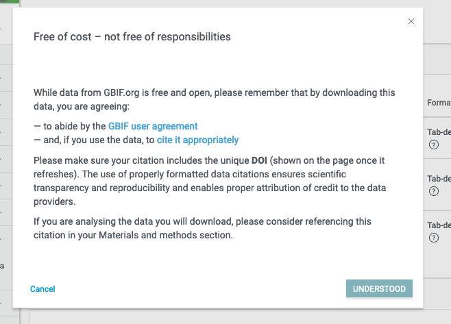 jaramilloetal2019_dfwrite.table(jaramilloetal2019_df, file = "jaramilloetal2019.csv", sep = '\t', quote = TRUE)Sempre que utilizar um conjunto de dados em uma publicação, cite o conjunto de dados! Como exemplo, veja abaixo como obter a citação de um conjunto de dados depositado no GBIF.