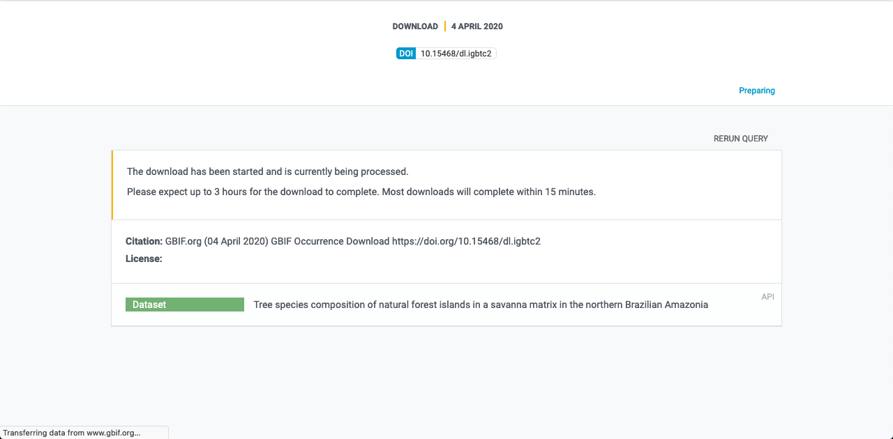 gbif_citation(silvaetal2019)Repare que há dois objetos resultantes, um chamado download, e outro chamado dataset, ambos apresentando um DOI. O primeiro se refere ao conjunto de dados baixado via rgbif ; caso você baixe manualmente, você pode também encontrar um DOI para esse download manual. O segundo se refere ao DOI do conjunto de dados propriamente dito e armazenado no repositório de dados.
