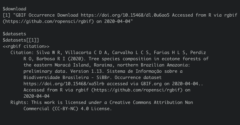 Embora não seja um artigo científico, conjuntos de dados depositados em repositórios de dados possuem um DOI, portanto, o conjunto de dados deve ser citado caso seja utilizado, conforme instrução do próprio GBIF. Para obter uma citação de um conjunto de dados do GBIF, por exemplo, o pacote rgbif fornece a função gbif_citation, que deve ser utilizada em conjunto com o objeto resultante da função occ_download_import. Tomando os dados de Silva et al. (2019) como exemplo, temos: