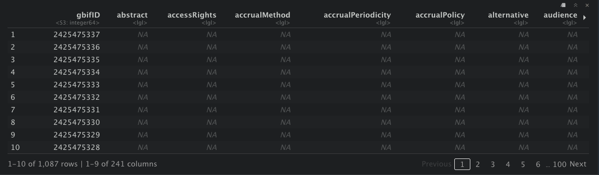 # ℹ 99 more variables: hostingOrganizationKey <chr>, publishingCountry <chr>,