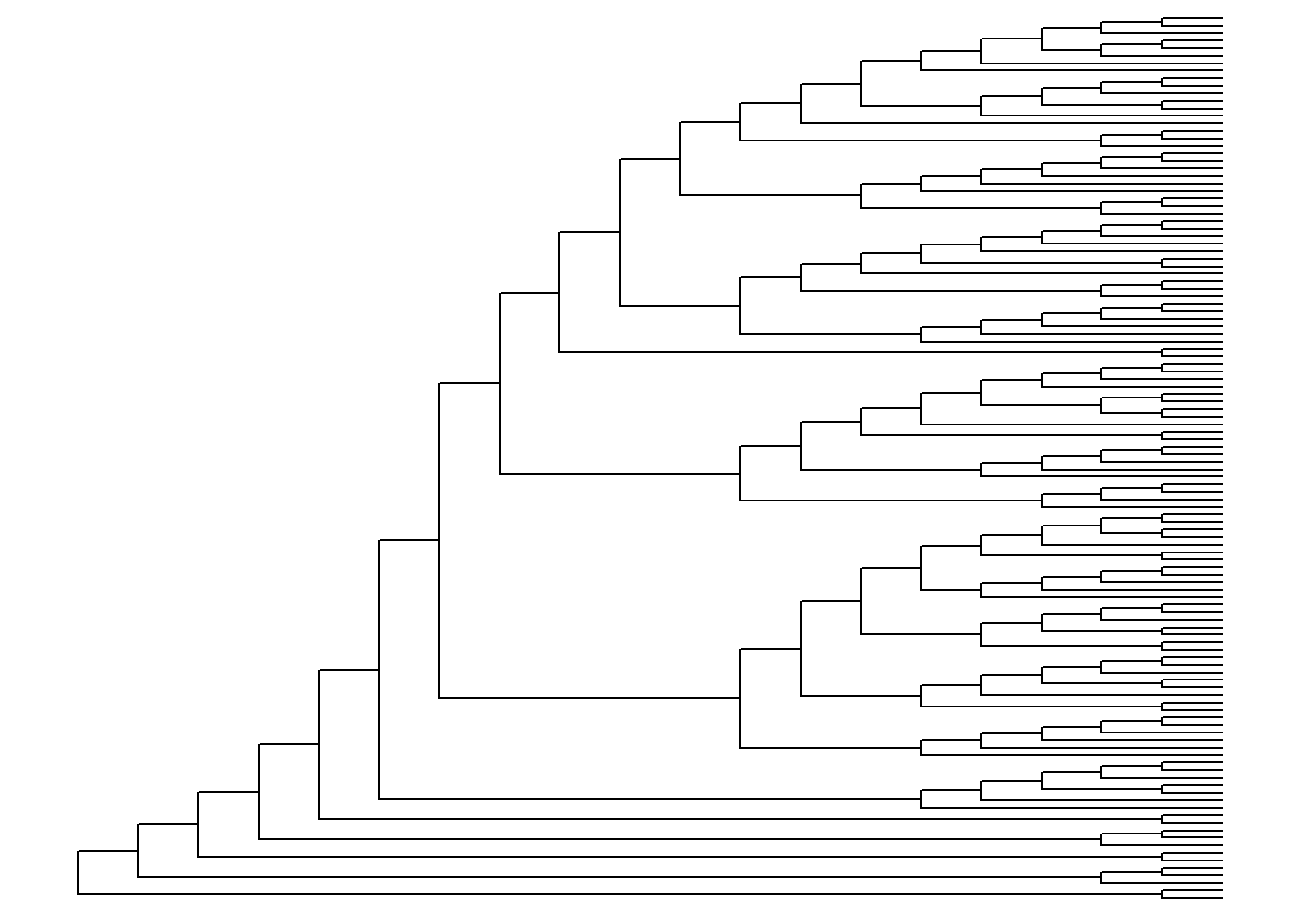 ggtree(arvore)Imediatamente, é plotada uma árvore. Por padrão, ela aparece em forma de escada (ladderized em inglês).